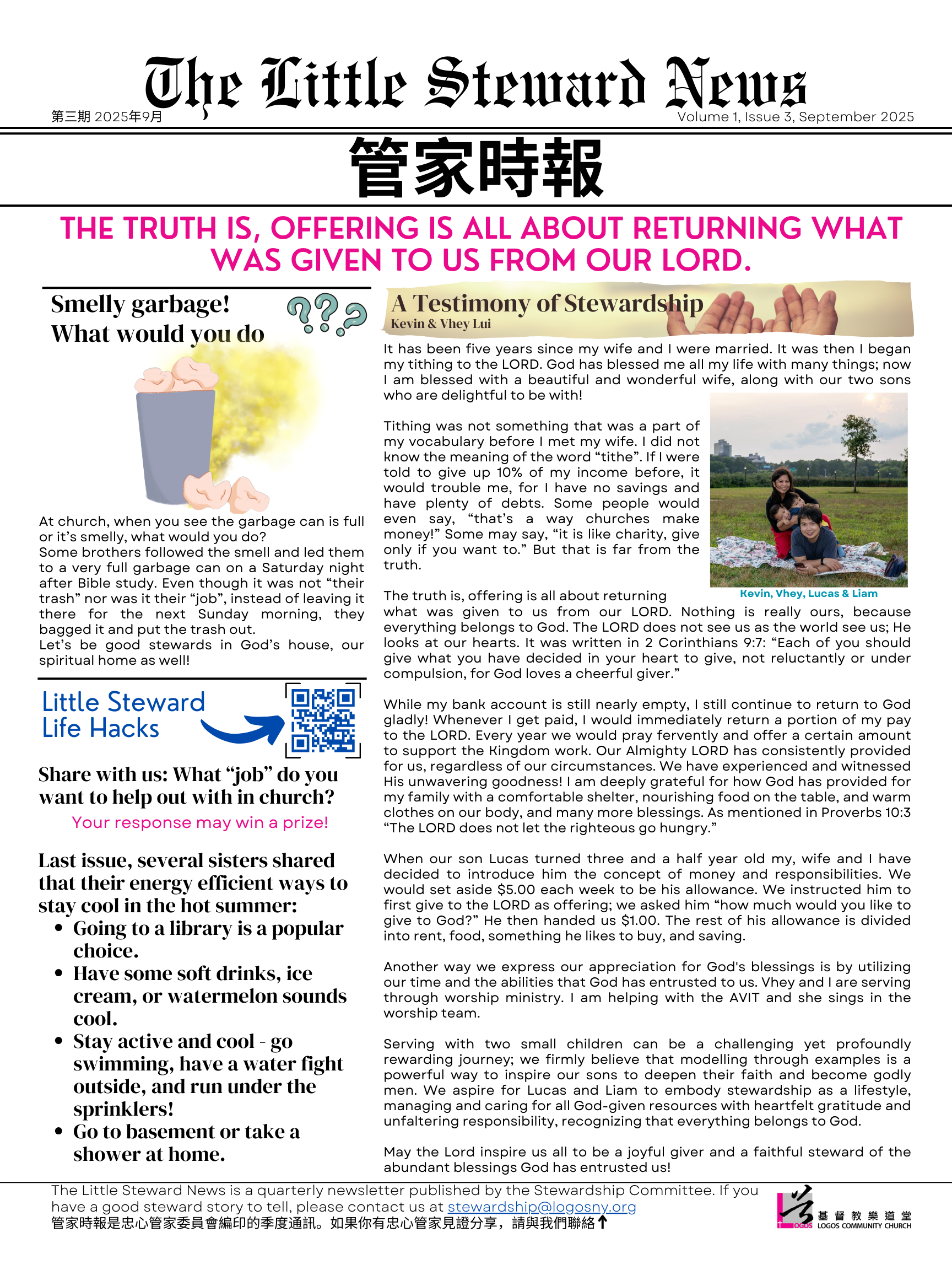The Stewardship Committee is pleased to announce our third issue of “The Little Steward News”! May you be inspired by the stewardship testimony and encourage you to be God’s stewards. We encourage you to participate in the life hacks and activities to learn from each other on how to be a faithful steward. You can also get a prize too!